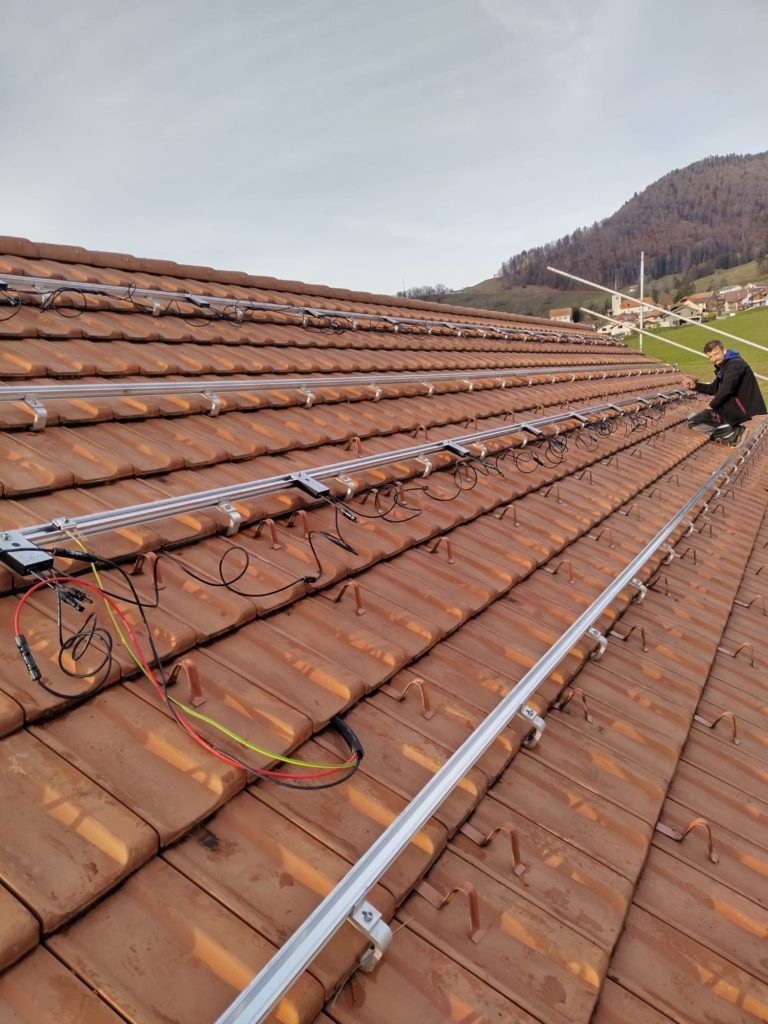 Installation en cours sur un toit en tuiles, en pleine campagne.