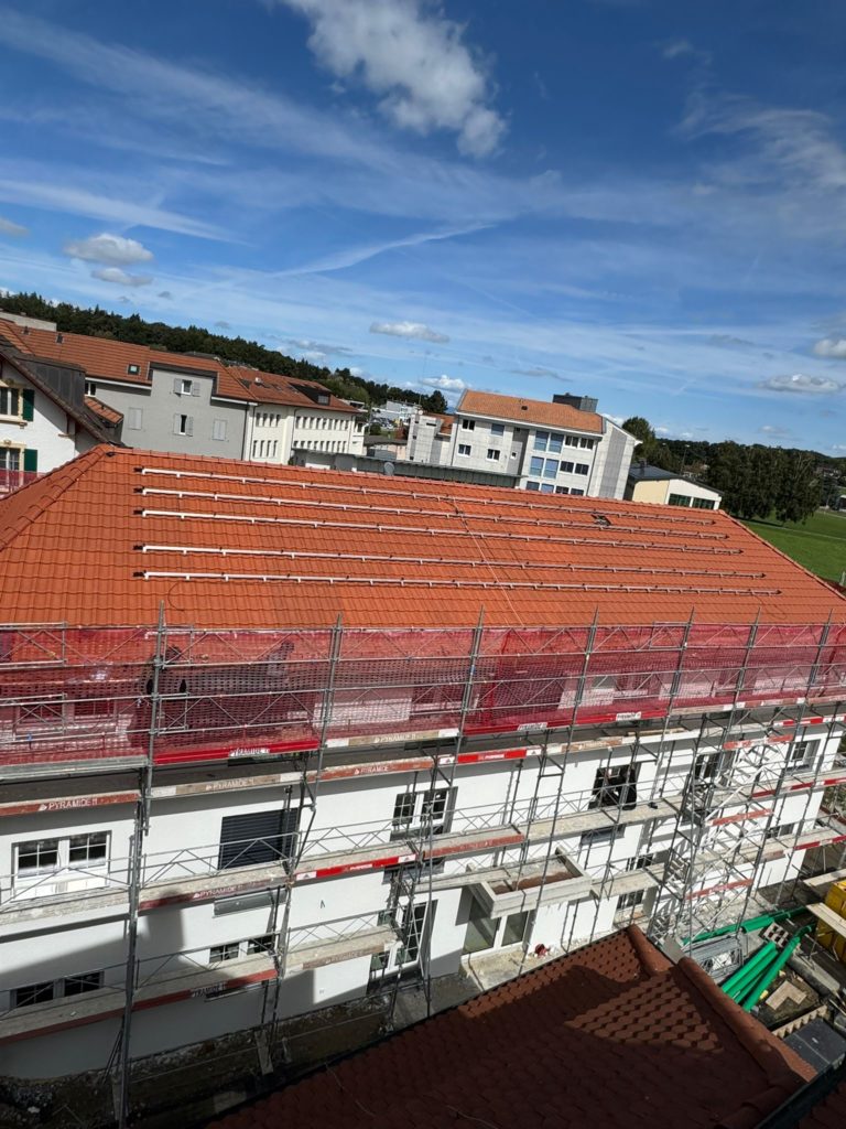 Rails installés sur une toiture en rénovation, avant la pose des panneaux solaires.