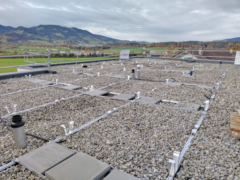 Mise en place des supports sur un toit plat, avant l’installation des panneaux.